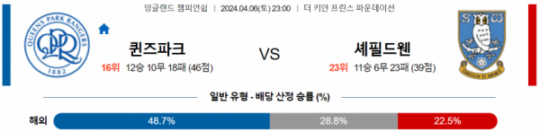 잉글랜드 챔피언쉽 4월 6일 23:00 퀸즈 파크 레인저스 : 셰필드 웬즈데이