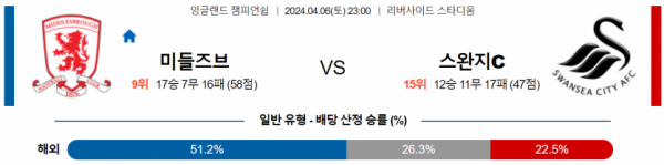 잉글랜드 챔피언쉽 4월 6일 23:00 미들즈브러 FC : 스완지 시티