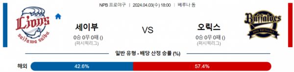 4월 3일 18:00 NPB 세이부 vs 오릭스 일본야구분석