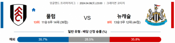 프리미어리그 4월 6일 23:00 풀럼 : 뉴캐슬 유나이티드